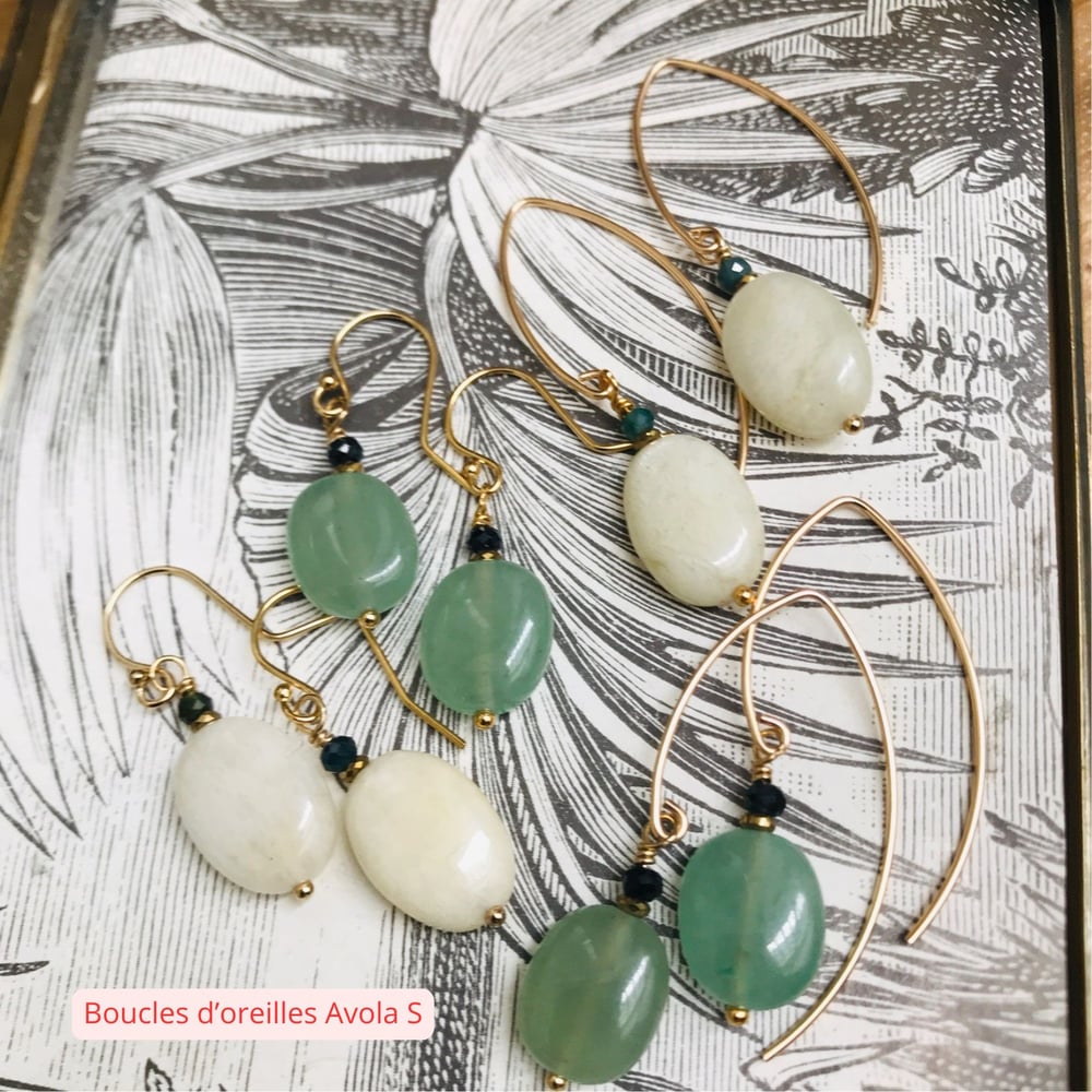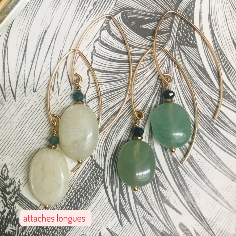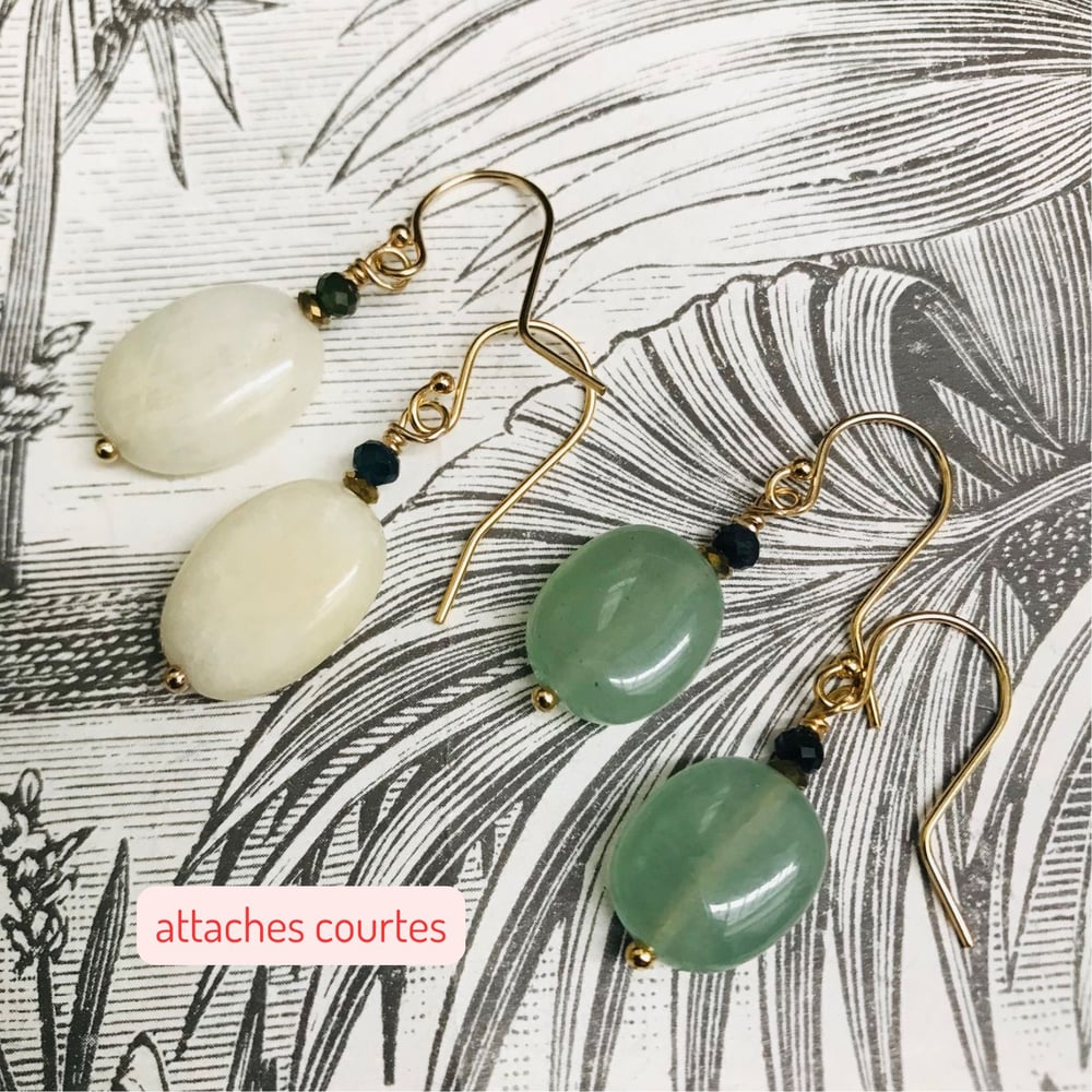 Boucles d'oreilles en Gold Filled 14kt pour une qualité optimale, Pierre de Lune ou Aventurine réhaussée d'une tourmaline grise.