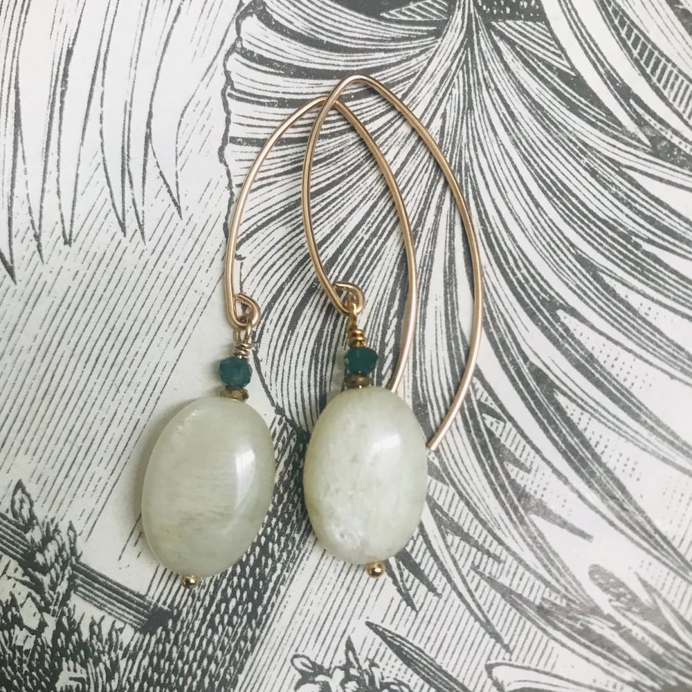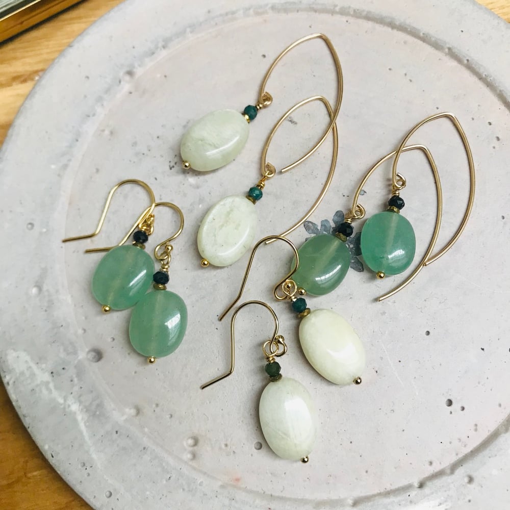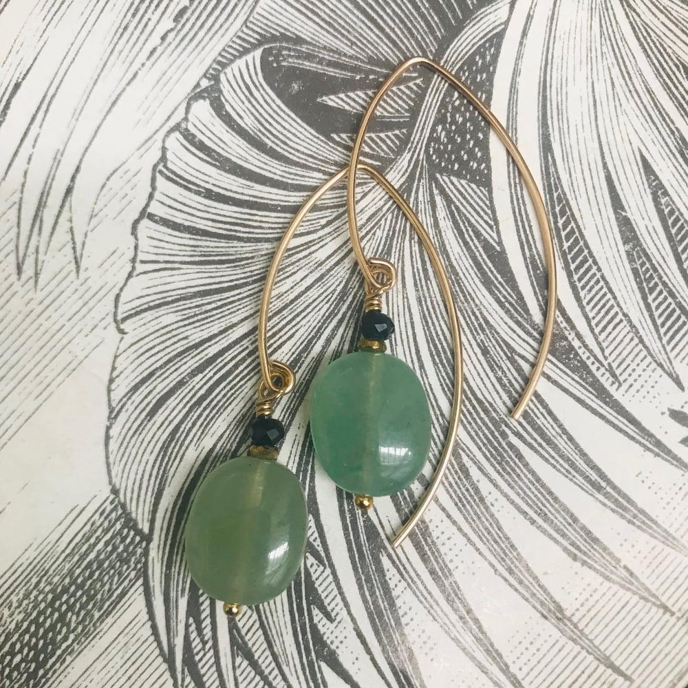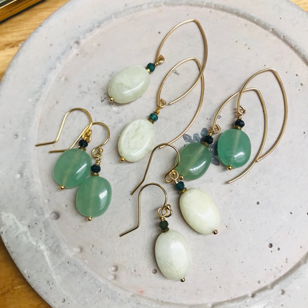 Boucles d'oreilles en Gold Filled 14kt pour une qualité optimale, Pierre de Lune ou Aventurine réhaussée d'une tourmaline grise.