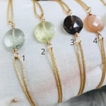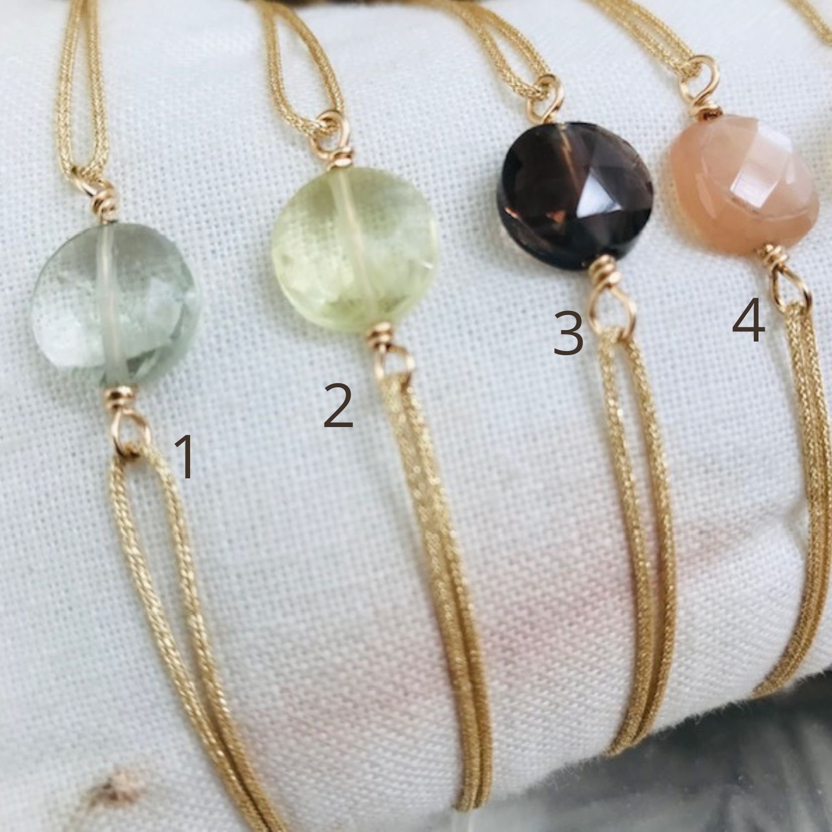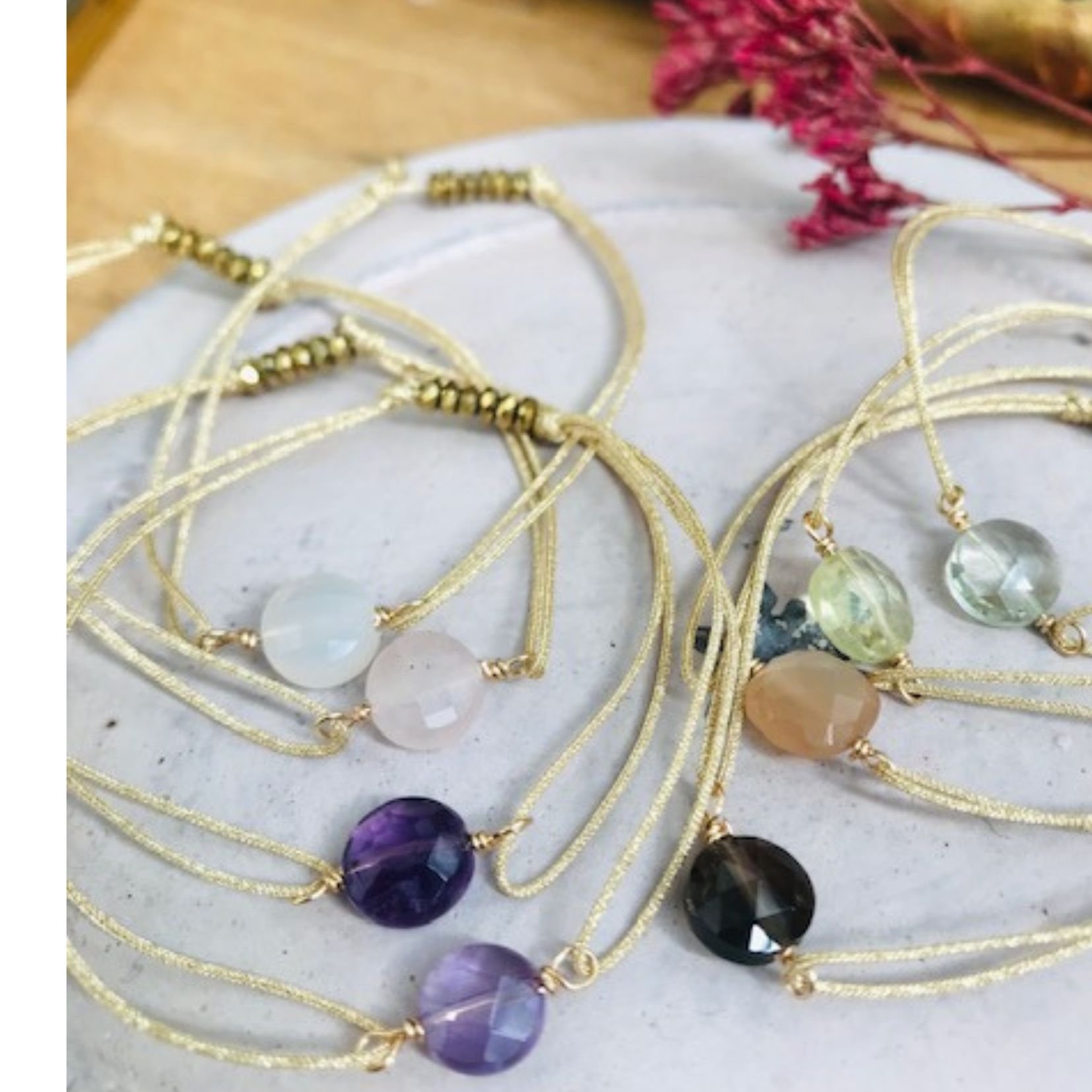 Bracelet sur fil doré ajustable et pierres naturelles et semi-précieuses.