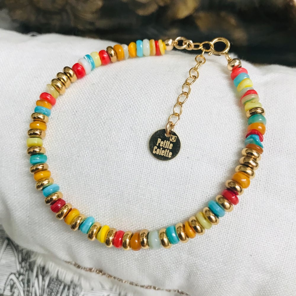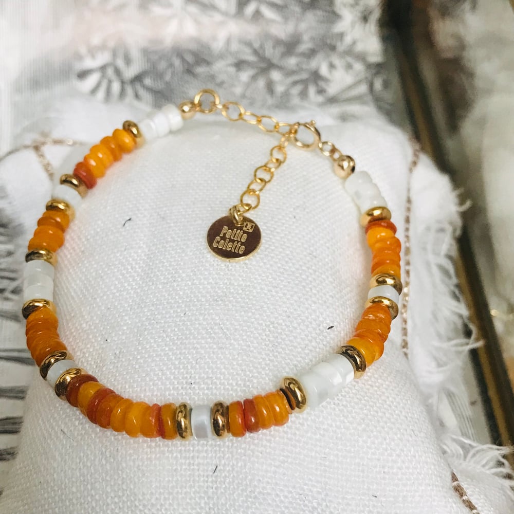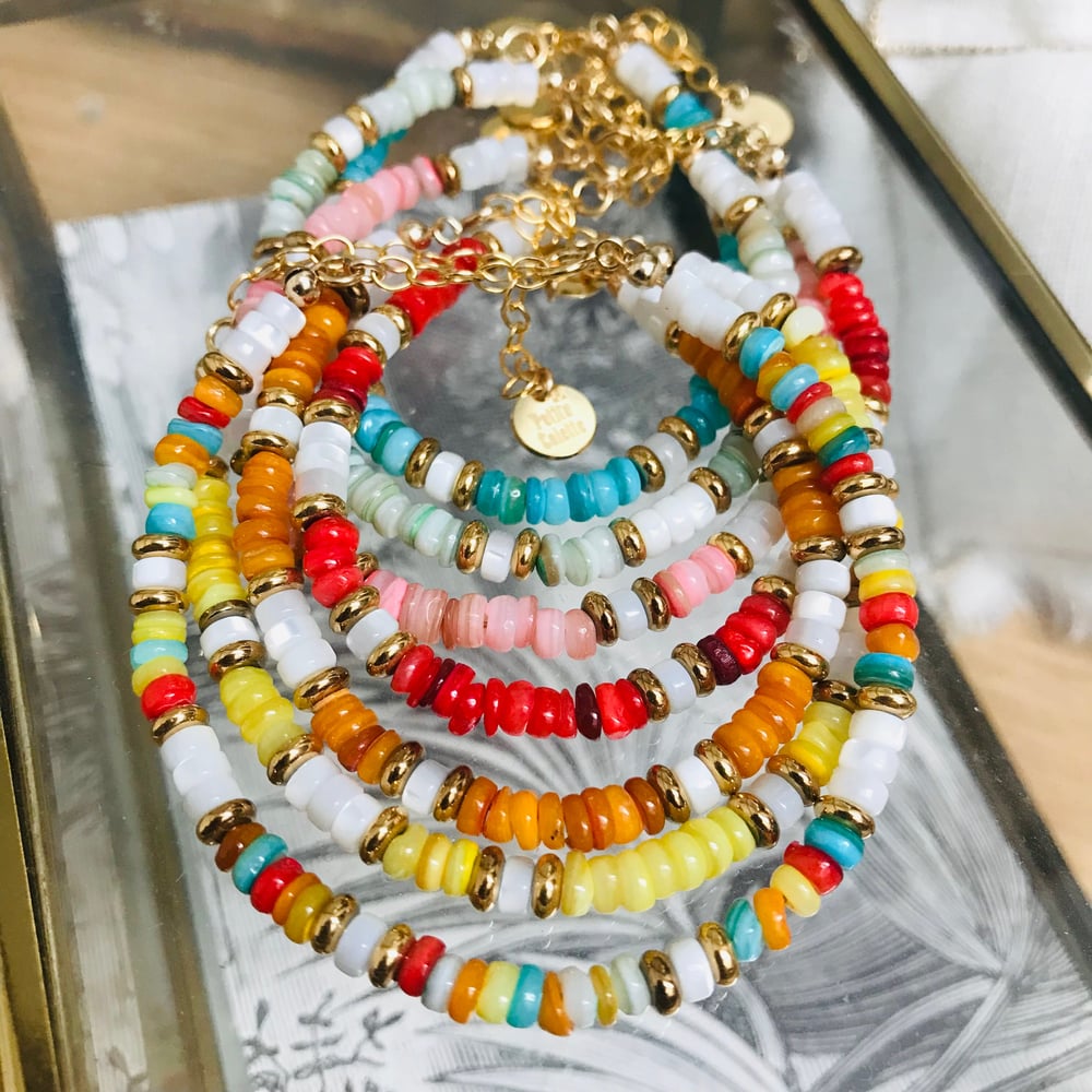 Bracelets en pierres naturelles nacre blanche et coquillages teintés.