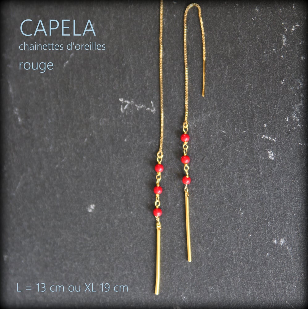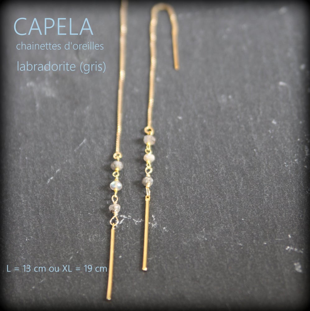 Chainettes d'oreilles plaqué or 3 microns (sur base argent) et pierres semi-précieuses.